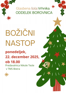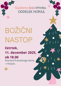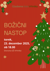 - Božični nastop oddelka na VRHNIKI: v torek, 23. 12., ob 18. uri v dvorani glasbene šole na Vrhniki.
