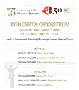 Naslednjo sredo, 11. februarja, se člani Pihalnega orkestra GŠ Vrhnika odpravljajo v Ljubljano. V prestižni dvorani Slovenske filharmonije bodo nastopili s pihalnima orkestroma GŠ Franca Šturma, ki ste ju imeli priložnost slišati lansko šolsko leto na Vrhniki. Tokratni skupni koncert bo ob 20. uri, vstopnice pa bomo razdelili le nastopajočim učencem. Zato ostanite v stiku in na preži za njihovim naslednjim koncertom! Če pa si želite popestriti večer, vabljeni na